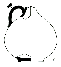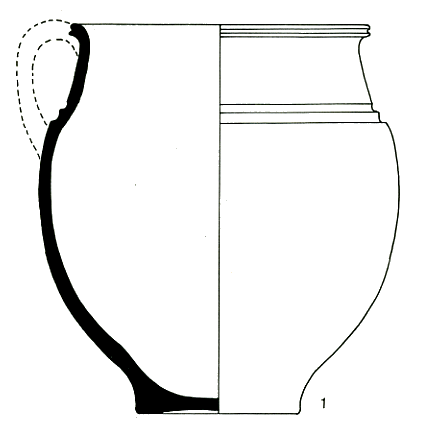 base étirée, assise concave ; anse s'attachant sur la lèvre et sur le haut de la panse ;