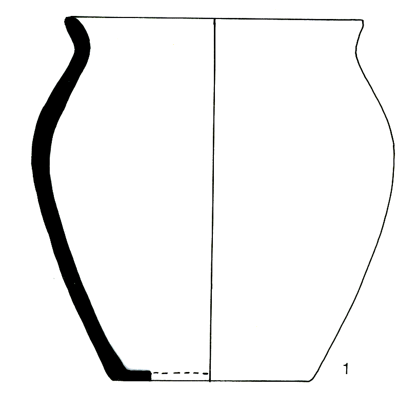 Pot de forme ovoide ; encolure verticale, concave, lèvre ronde ; base portante, assise plane ; céramique non tournée, couleur gris-bleu en surface et sur les cassures ; inclusions grossieres: quartz irrégulier en proportion moyenne, mica ; surface brute