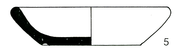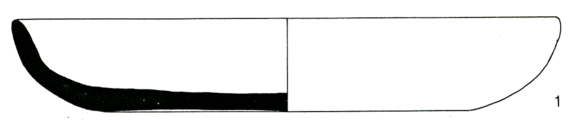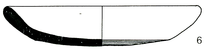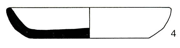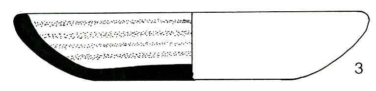 Assiette aux parois divergentes convexes ; lèvre convexe ; base portante, assise plane ; céramique tournée, pâte de couleur grise, noire en surface ; inclusions moyennes: quartz irrégulier en proportion moyenne, mica ; surface brute. Quatre lignes horizontales polies sur la paroi interne.