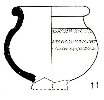 Pot de forme sphérique ; encolure rentrante, rectiligne, rebord en rouleau, lèvre ronde ; céramique tournée, couleur grise en surface et sur les cassures ; inclusions moyennes: quartz irrégulier en proportion moyenne, mica ; surface brute. Trois lignes polies sur le haut de la panse.