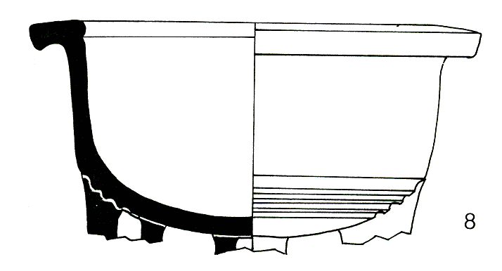 Marmite tripode aux parois divergentes convexes en bas, puis verticales rectilignes ; rebord en méplat débordant, lèvre plate ; pieds en tétine verticaux ; céramique tournée, couleur blanche en surface et sur les cassures ; inclusions fines: quartz irrégulier en proportion moyenne, traces de mica ; surface brute. Quatre sillons au niveau de l'attache des pieds.