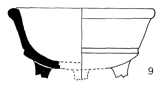 Marmite tripode aux parois divergentes convexes en bas, puis divergentes rectilignes ; rebord en rouleau, lèvre ronde ; pieds coniques évasés ; céramique tournée, couleur orangée en surface et sur les cassures ; inclusions grossières: quartz irrégulier en proportion moyenne, mica ; surface brute.
